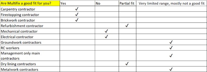 A1 Multifix A1 Multifix Is Multifix the right fit for you? In the world of construction, it’s very important that you have a supplier whom you can trust, who is reliable and who understands your needs. After all, not having the right construction supplier can lead to many problems. Above all else, it can be hugely detrimental to your work. Not having items turn up on time – or at all – can be costly, in more ways than one. At Multifix, that is where we step in. With speed, reliability and a personal touch at the heart of what we do, we have been supplying the construction industry for 30 years and counting. However, that doesn’t necessarily mean that we are right for you. Obviously, as a business first and foremost, we love having new customers onboard to supply the products for their projects. We love helping new people, seeing the progress you make and knowing we’ve been a small part of that along the way. But, we don’t cater for everyone. There was a time when Multifix tried to service nearly every sector, but we found we couldn’t provide the best service by spreading ourselves so thinly. Now we are more focused and can really tailor our solutions to our customers’ needs. With that in mind then, here is an explanation of who we believe we’re a good fit for and who we aren’t. Who is a GOOD fit for Multifix? If you’re a: specialist carpentry, brickwork, or firestopping or refurbishment contractor then we absolutely can help you with whatever you need. This is especially the case with the three mentioned. Whether it’s first and second-fix carpenters or housebuilders, our products and service can be a great asset for you and your company. When it comes to carpentry, brickwork and passive fire, we specialise in these sectors. We have dedicated teams allocated to each industry to help you not only get the best service, but the best products for the job. If you work in refurbishment, we don’t cover that as broadly, but we still do have speciality areas we can provide for. The reason why we don’t cover it in as much depth is because we don’t have the product range for it. If you’re based in London or the south-east especially, we really can be of use. We have a 5pm cut-off time for our own van next-day delivery, with a fleet of our own drivers nearby to get your goods to you quickly. If it’s outside of our reach and going nationwide, it’s a 4pm cut-off time and we will send a courier. You can see a full breakdown of where we deliver to here. Who is a BAD fit for Multifix? The short answer would be anyone that hasn’t been mentioned, as we don’t stock the specialist range of products the sectors need to complete projects. However, that is a slightly flawed response, as while we don’t have a full range of stock for the other sectors, we do still supply some products of note. One exception to this though, is mechanical and electrical. We simply don’t have the correct range of stock for that sector, as we’ve discontinued many of our mechanical and electrical product lines, so we are not a good fit for companies in that realm. When it comes to groundwork contractors or RC frame workers, we also don’t have the range. We do offer resins and basic hand tools, but we don’t supply much more beyond that for that industry. It’s a similar story with management-only main contractors. We do supply a wide range of PPE, which you can find out more about here, but the clothes and helmets are all unbranded. When it comes to clothing, we only offer non-branded items of PPE. The only slight exception to the rule is with the dry-lining sector. Unlike the others mentioned, we do have a wide range of fixings available for dry lining. We don’t have the more specialist items, but we do have a strong supply of dry-lining fixings. We also stock some metalwork, but the caveat to that is that, much like the PPE, it’s all unbranded. We also don’t stock British Gypsum, which we know can be a deal-breaker with the dry-lining sector. Factoring in everything, we are perhaps more of a partial fit for dry-lining, but not quite a round peg in a round hole. Making sure Multifix is right for you One of the main points of this article is that we don’t want to let you down. We don’t want you to waste your time asking us for products we don’t stock, for sectors we don’t cater for. It may mean we get fewer calls or emails as a result. However, if it means the ones coming in are from people who know we’re a good fit for them, that’s in everyone’s best interests. We take great pride in what we have achieved in the carpentry, brickwork and passive fire sectors, in addition to refurbishment. If you would like to browse our range, you can do so here. Equally, if you wish to speak to one of our expert teams about an upcoming project or anything else, you can do so here. Related posts "Adam goes over exactly what he thinks of Multifix, whether he's had any issues or recom..." Watch Adam Fletcher's story